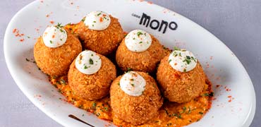 Seis bolinhos de alheira da casa recheados com queijo minas, servidos com aioli de aji panca e pasta de pimentões assados. A nossa versão turbinada e cremosa dos bolinhos de alheira da Casa Mono.