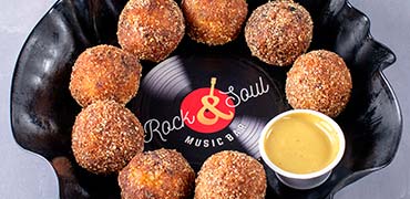 Bolinho de batata doce recheado com carne seca e queijo mussarela, ou sua versão vegana de palmito ao alho frito.